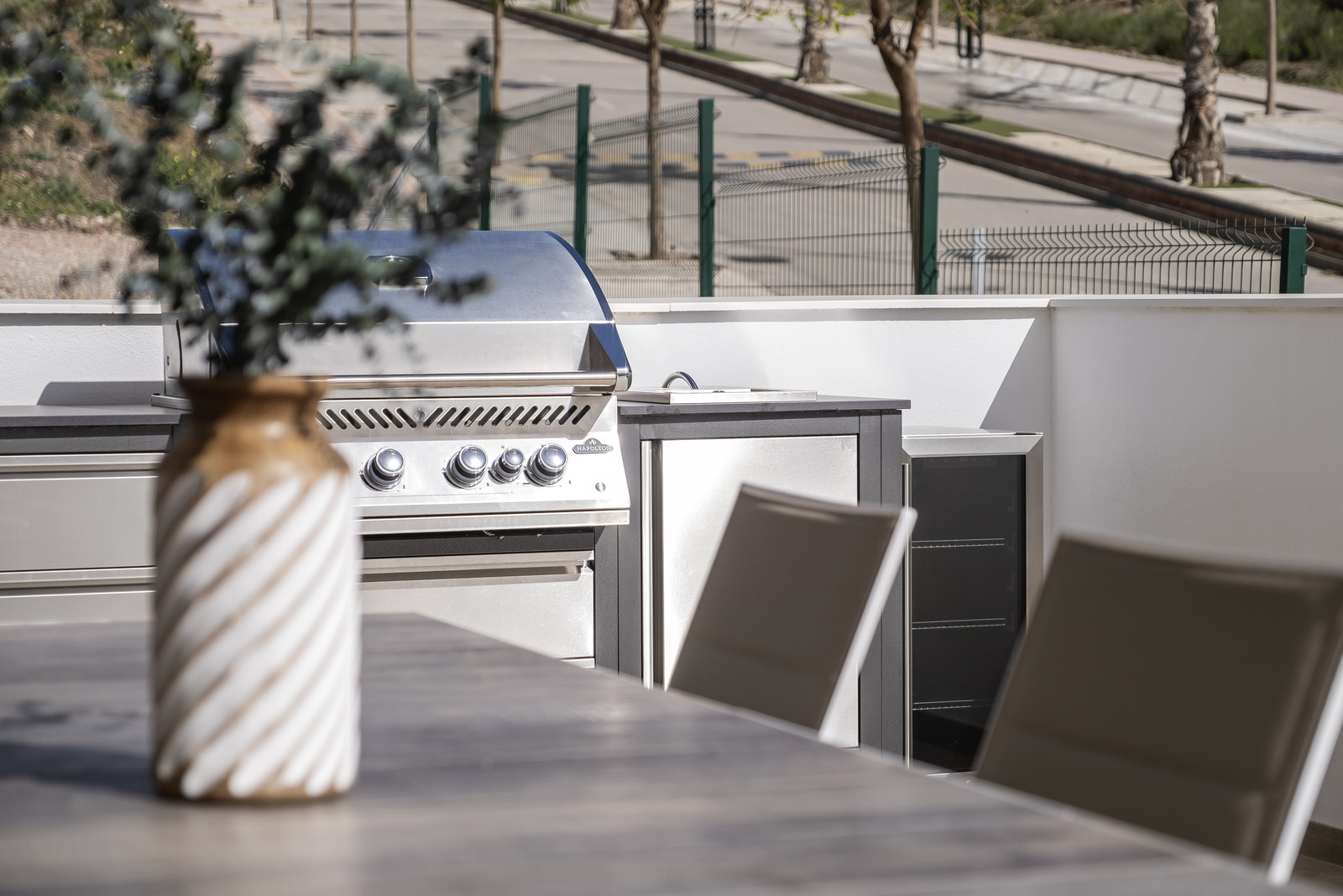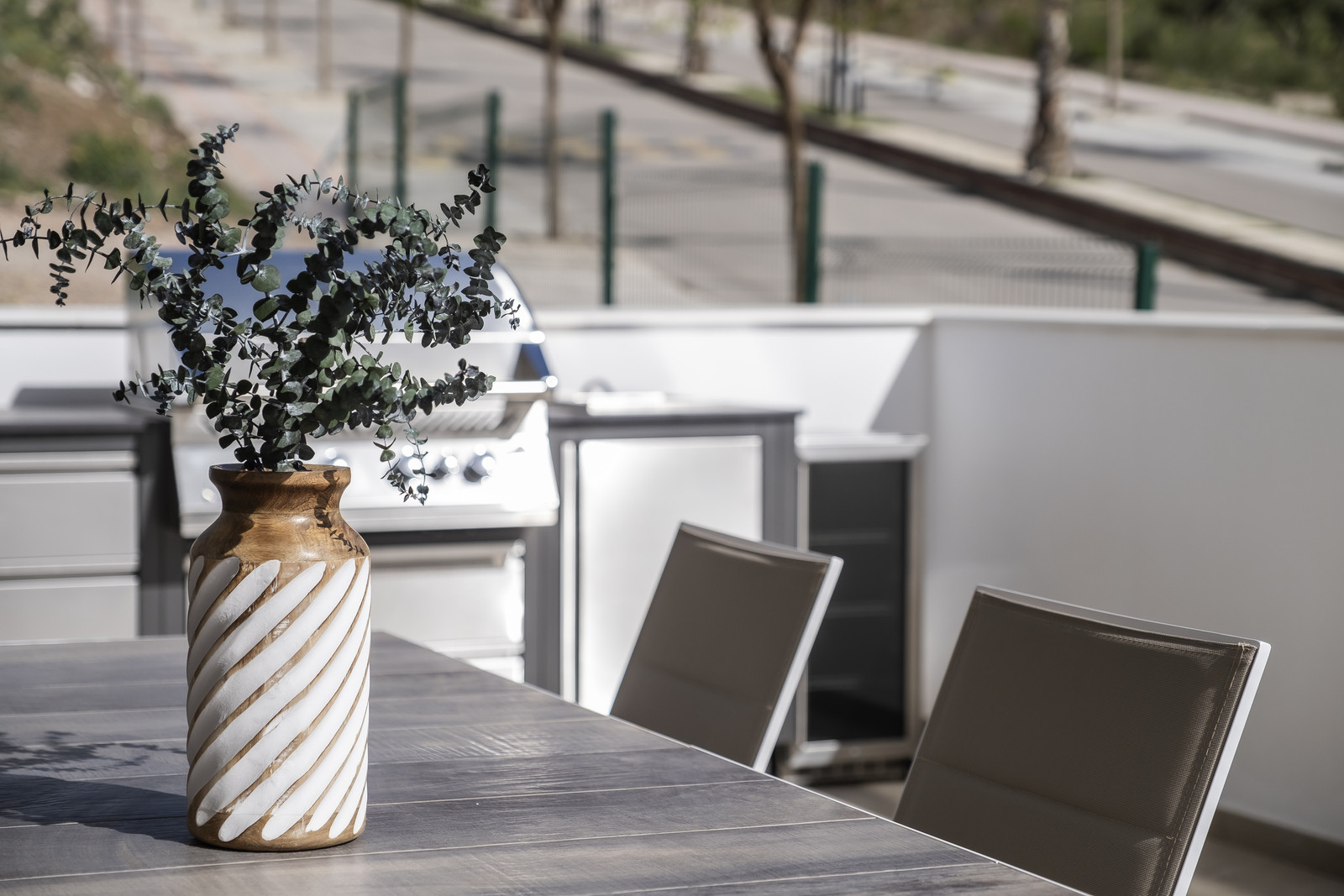 The apartment offers a generous interior usable surface of 84.83 m², complemented by extensive outdoor areas. The main terrace, together with an additional interior patio, provides a total usable outdoor surface of 83.96 m², bringing the total usable living space to 138.77 m². The large terrace is one of the highlights of the property, offering sea views and a well-designed barbecue area that is ideal for outdoor dining and relaxed evenings.