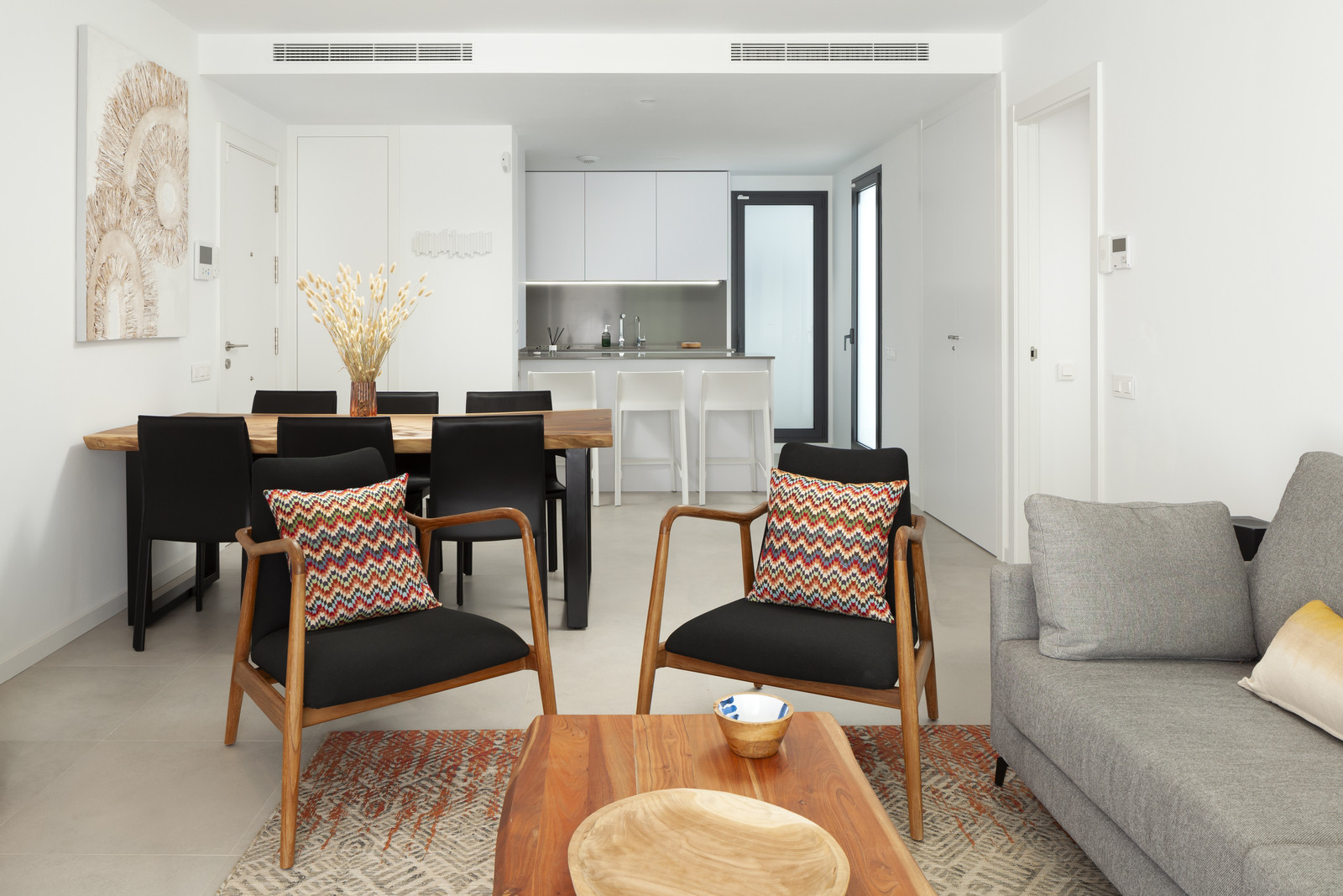 Inside, the apartment features a bright and practical layout with three bedrooms and two bathrooms. The living and dining area opens directly onto the terrace, creating a seamless connection between indoor and outdoor living. The kitchen is fully equipped and designed for both short and longer stays, offering everything needed for a comfortable holiday.