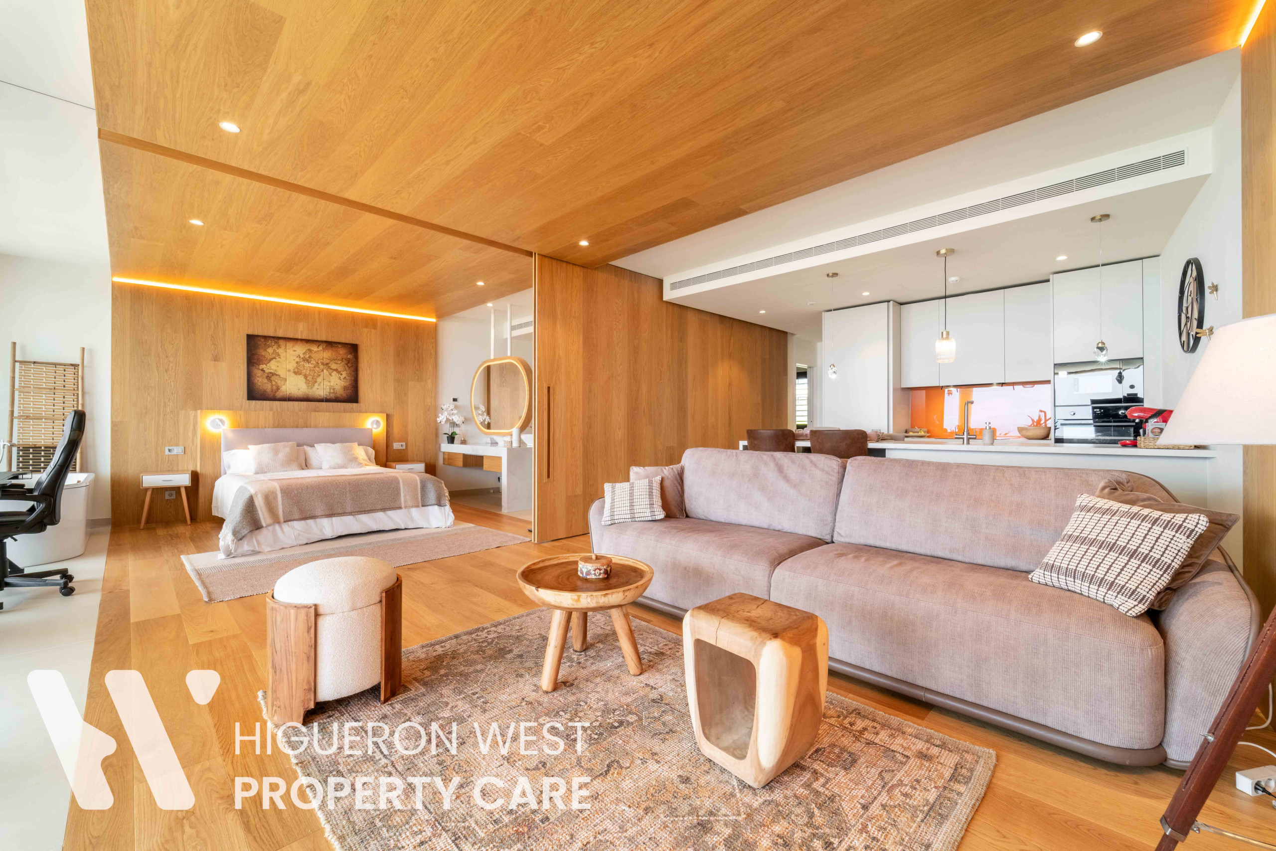 A unique feature of this home is the flexible master bedroom, which can be opened to the living area through a full sliding wall, creating an even greater sense of space and light, or closed off for privacy when needed. The second bedroom is equally comfortable and well-designed, while both bathrooms feature modern finishes and walk-in showers.